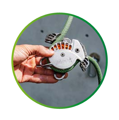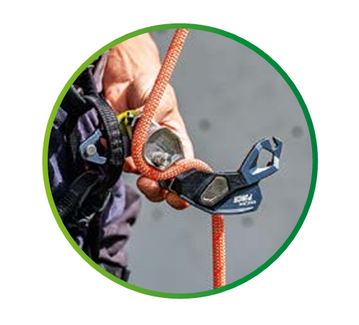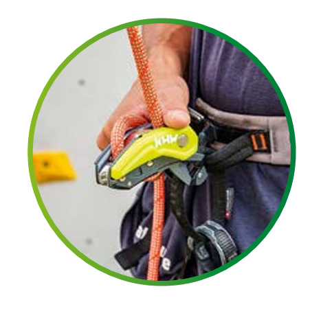 Sein bidirektionaler Blockiermechanismus verhindert das falsche Einlegen des Seils. Wird das Seil zu schnell durchgezogen (> 4 m/s), arretiert das Gerät nach dem Fliehkraftprinzip automatisch. Ein ungebremster Bodensturz ist somit praktisch ausgeschlossen – außer bei übermäßigem Schlappseil und/oder falscher Klinkposition.